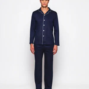 Pijama largo de tela. La chaqueta es de manga larga, con tres bolsillos, uno en el pecho y dos frontales. El pantalón es largo, sin bolsillo, con cierre de botones y bragueta cruzada en V. Completa tu look homewear con la bata a juego del mismo tejido.